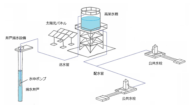 ハンドポンプ付深井戸建設 75ヶ所 太陽光システム給水施設建設 6サイト 高架水槽 6基(30㎥~60㎥)、太陽光揚水システム 6ヶ所、 配管 19km、守衛室 6棟、公共水栓 53ヶ所 資機材納品 |