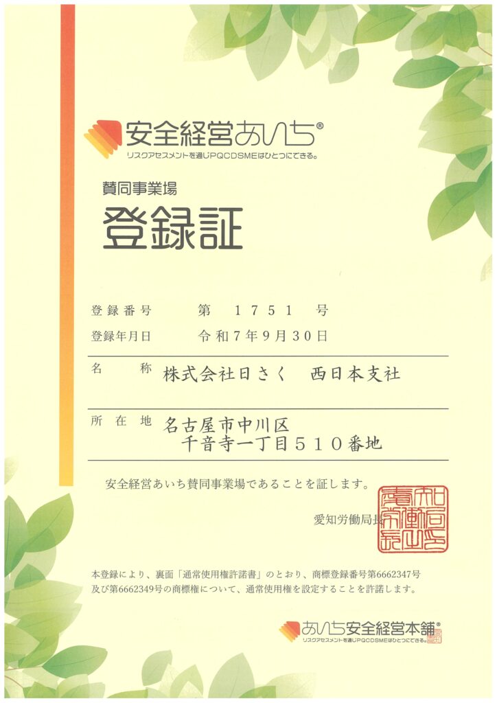 当社西日本支社は、この度愛知労働局が推進する「安全経営あいち®」に賛同し、同制度の賛同事業場として登録されました。
