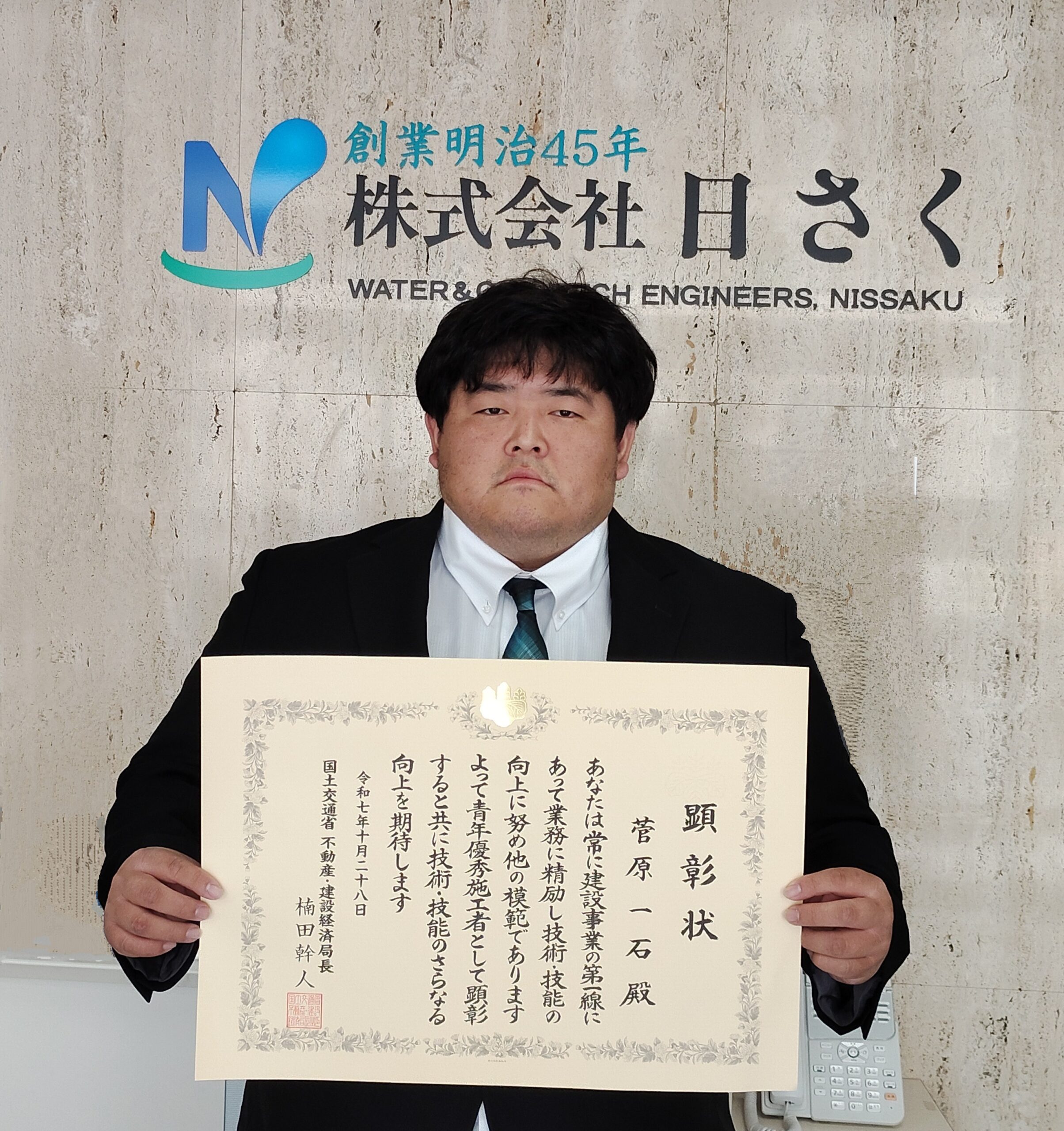 国土交通省不動産・建設経済局長より、さく井工の青年優秀施工者(建設ジュニアマスター)として菅原一石が顕彰されました。