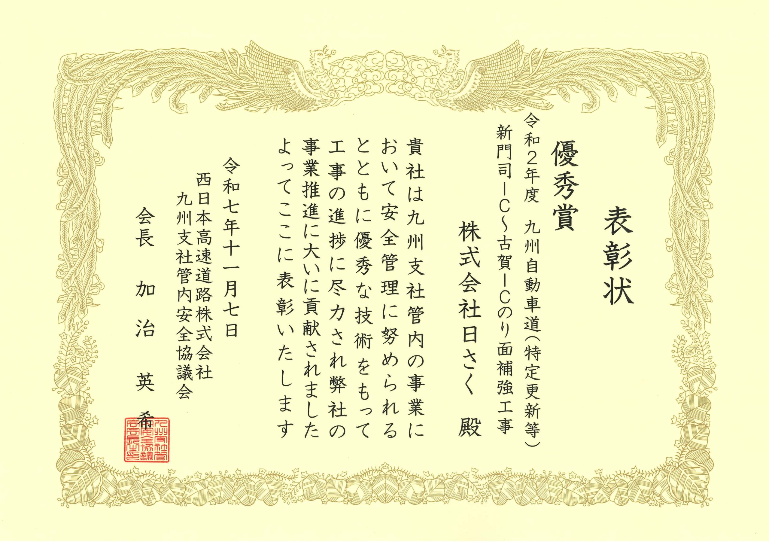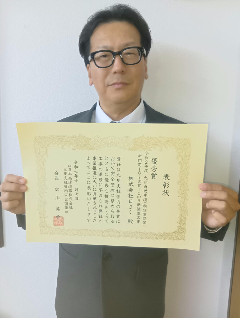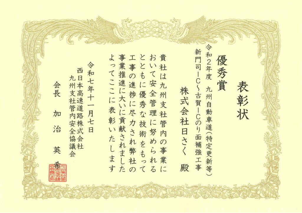 西日本高速道路株式会社 九州支社管内安全協議会より、当社が安全管理優良事業者として表彰されました。