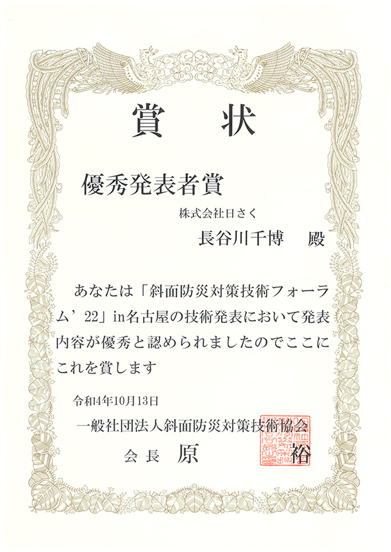 一般社団法人斜面防災対策技術協会より「斜面防災対策技術フォーラム’22」in名古屋における優秀発表者として長谷川千博が表彰されました。