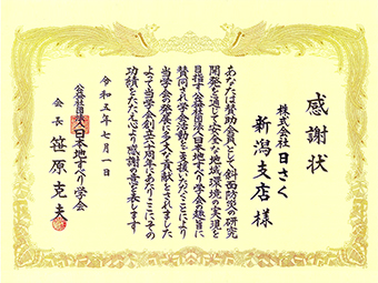 公益社団法⼈⽇本地すべり学会より、賛助会員として学会活動を⽀援したことについて感謝状が贈呈されました。
